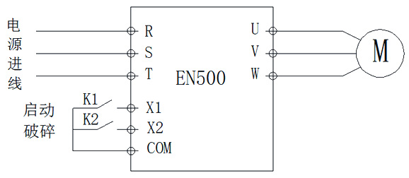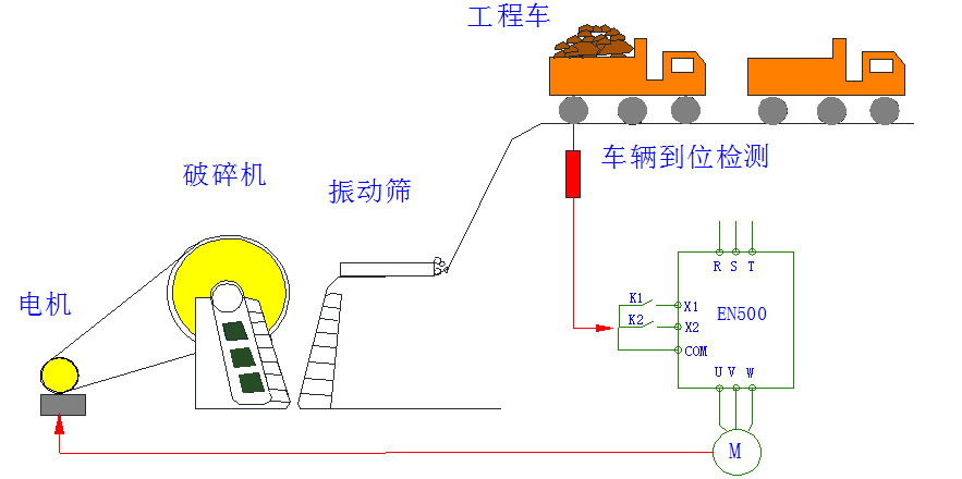 選擇EN500-4T450G/P變頻器,破碎石料運(yùn)行50HZ,空載運(yùn)行30HZ;運(yùn)料車工程車卸貨處安裝位置檢測(cè)開關(guān),運(yùn)料車到位輸出信號(hào)給變頻器,變頻器加速到50HZ,運(yùn)料車離開經(jīng)過1.5分鐘結(jié)束破碎,變頻器減速到30HZ運(yùn)行,周而復(fù)始。設(shè)置兩段加減速時(shí)間:第一段加速?gòu)?HZ到30HZ,設(shè)置加速30秒;第二段30HZ到50HZ加速20秒,從50HZ到30HZ,減速時(shí)間40秒。