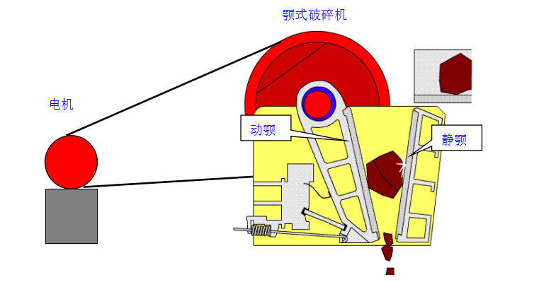 顎式破碎機(jī)工作部分是兩塊顎板組成,靜止的是定顎,另一個(gè)做上下往復(fù)運(yùn)動(dòng)的是動(dòng)顎。動(dòng)顎與靜顎不停的分開和靠近,物料進(jìn)入破碎腔,受到擠壓,彎折和劈裂作用而破碎。