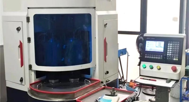 該雙軸端面磨床適用于數(shù)控刀片及五金零部件精密平面研磨,可應(yīng)對(duì)硬質(zhì)合金、金屬陶瓷等材質(zhì)。其結(jié)構(gòu)主要由一個(gè)圓形旋轉(zhuǎn)工作盤(pán)以及兩個(gè)立式升降磨頭(精磨和粗磨)組成,每個(gè)升降磨頭內(nèi)部為砂輪主軸。